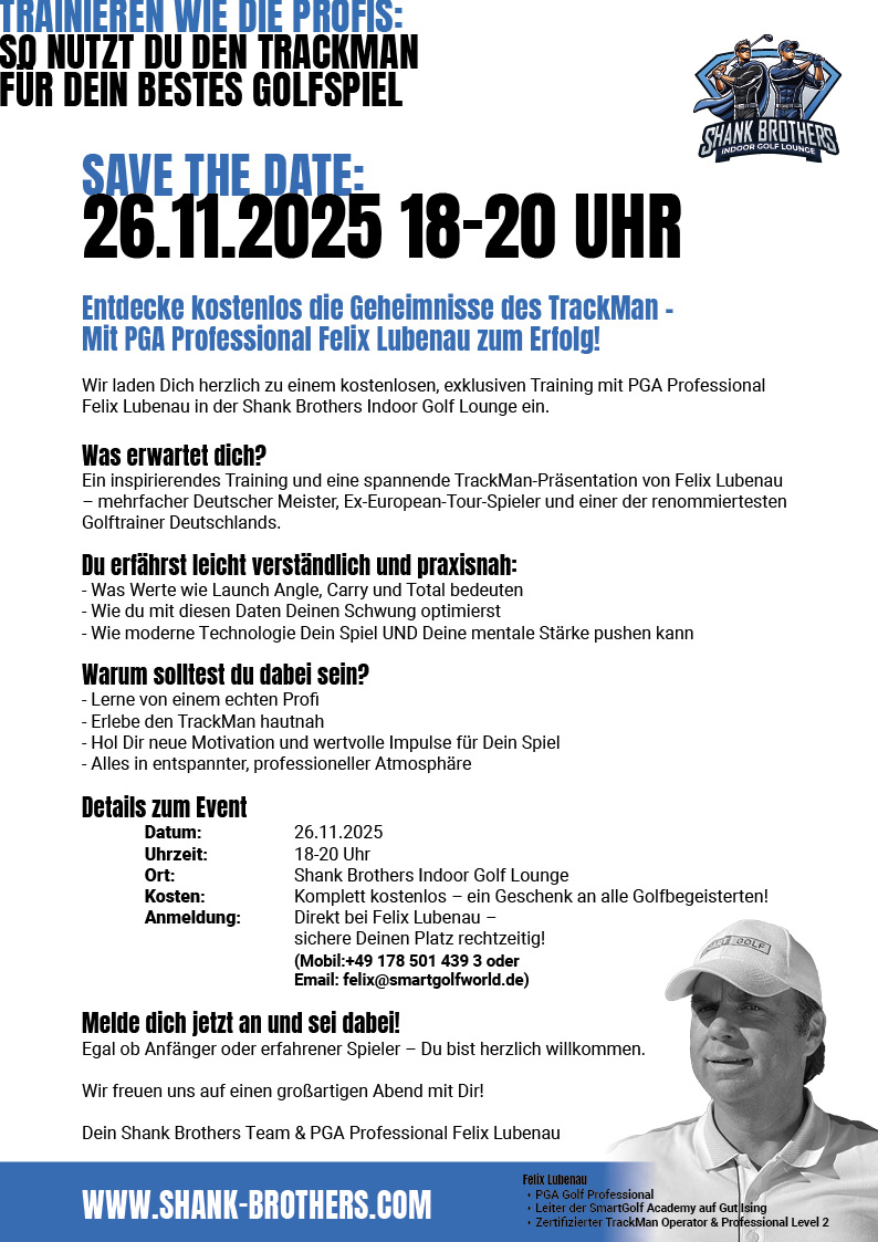 Am 26.11.2025 von 18–20 Uhr erwartet dich in der Shank Brothers Indoor Golf Lounge ein kostenloses Training mit PGA Professional Felix Lubenau.Erlebe, wie moderne TrackMan-Technologie dir hilft, deinen Schwung zu verbessern, Daten richtig zu verstehen und dein Golfspiel gezielt zu optimieren. Warum teilnehmen? Lerne direkt vom mehrfachen Deutschen Meister Erhalte klare Einblicke in Launch Angle,… Trainiere wie die Profis mit PGA Pro Felix Lubenau & mit dem Shank Brothers TrackMan! weiterlesen